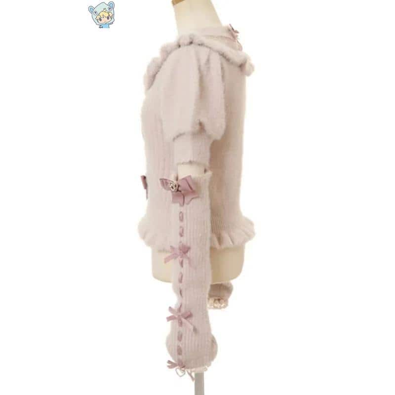 Ein entzückender Pullover im Sweet Lolita-Stil für den Herbst mit japanischem Mädchen-Flair, niedlichen Schleifen, Rüschen und kuscheligen Übersleeves in Harajuku-Stil.