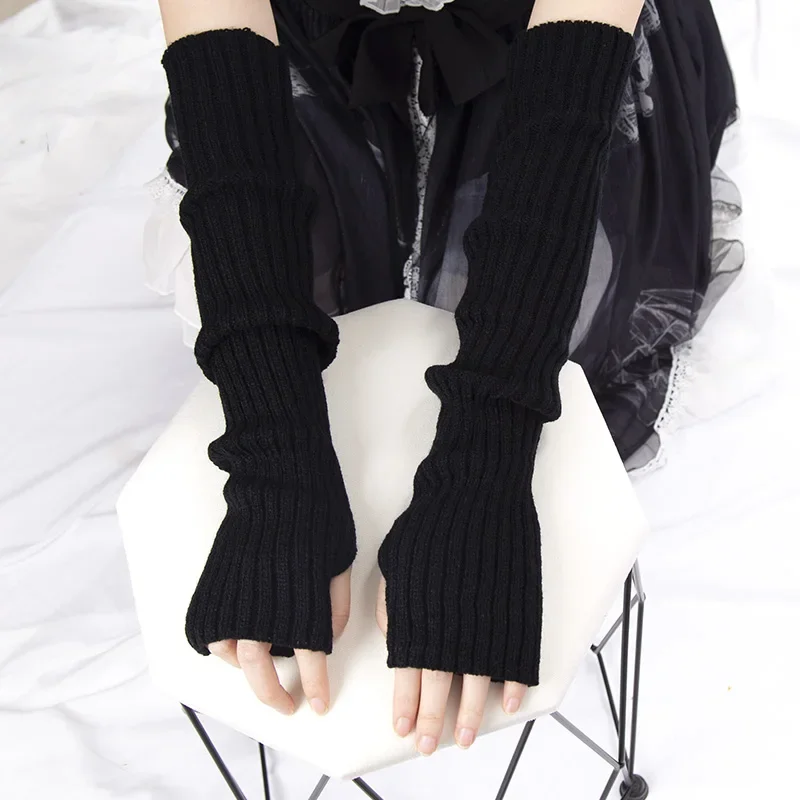 White Lolita Style Long Fingerless Gloves Women Winter Arm Warmer Knitted Arm Sleeve Casual Soft Girls Punk Gothic Mittens