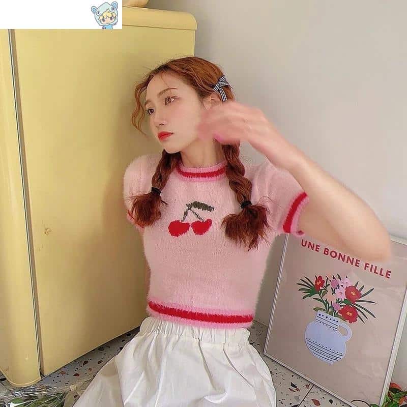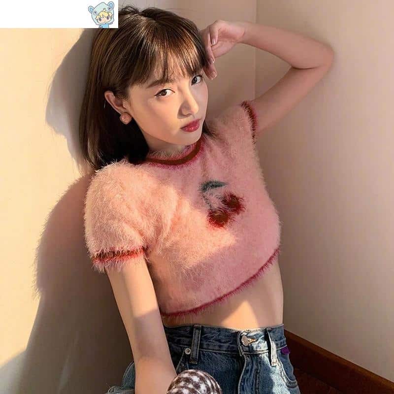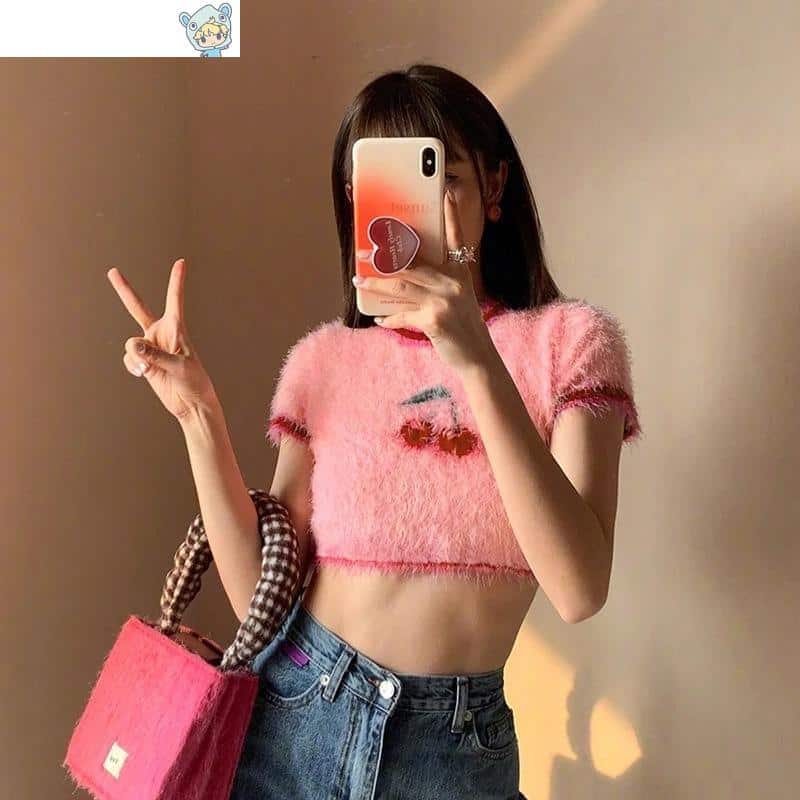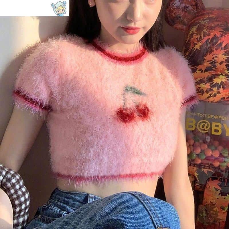 Plüsch Kirschenmuster T-Shirt Pinkgestrickte Crop Tops O-Neck Pullover Tops Tees